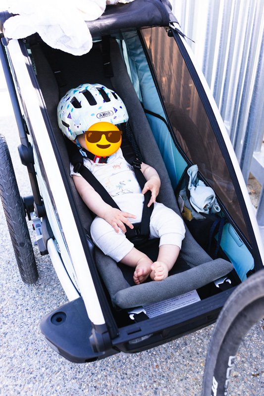 Petite anecdote, un jour nous nous faisons doubler par quelques cyclistes, à 15km/.h ce n’est pas rare, puis ils regardent dans la remorque, et s’étonnent que ce soit un vrai bébé, et pas un chien.